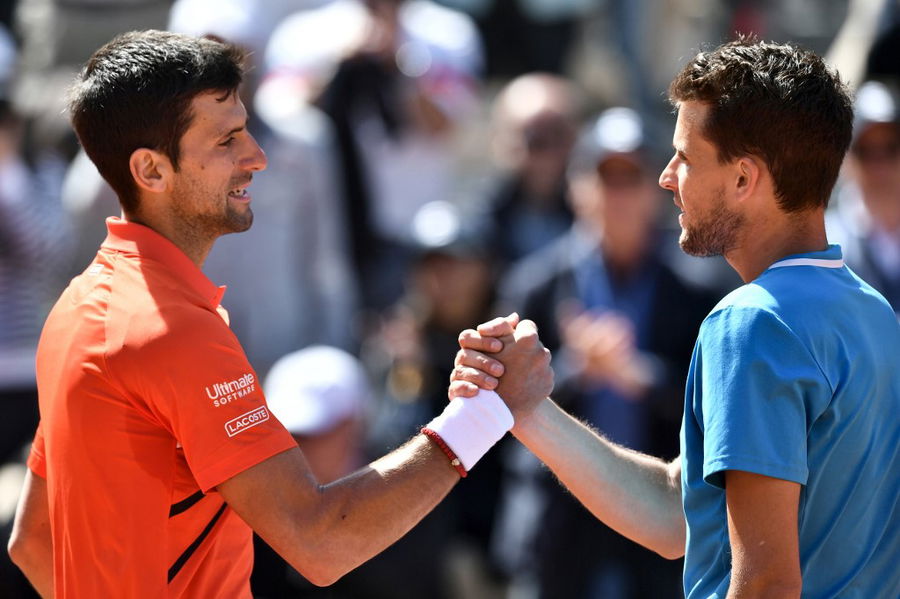Dominic Thiem and Novak Djokovic shake hands at the end of their men’s singles semi-final match at Roland Garros 2019 (Photo by Philippe Lopez / AFP)