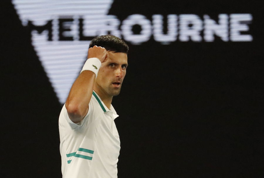 Tennis – Australian Open – Men’s Singles Final – Melbourne Park, Melbourne, Australia, February 21, 2021 Serbia’s Novak Djokovic reacts during his final match against Russia’s Daniil Medvedev REUTERS/Asanka Brendon Ratnayake