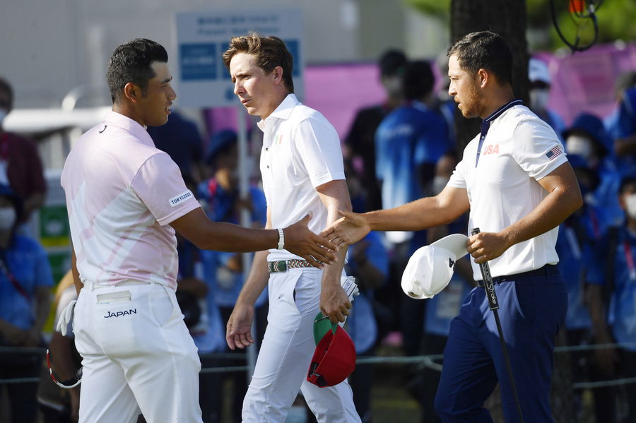 Tokyo 2020 Olympics – Golf – Men’s Individual – Final – Round 3 – Kasumigaseki Country Club – Kawagoe, Saitama, Japan – July 31, 2021. Xander Schauffele of the United States shakes hands with Hideki Matsuyama of Japan. REUTERS/Toby Melville