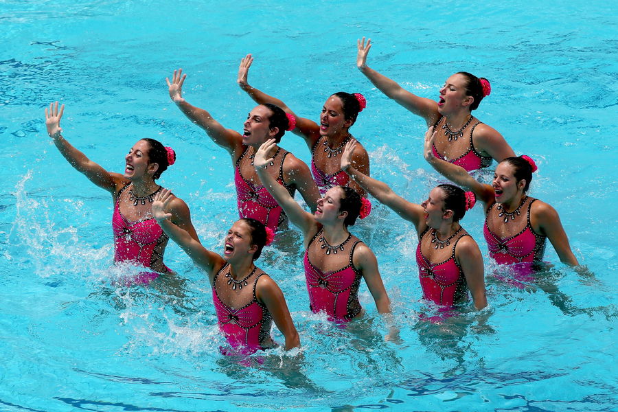 RIO DE JANEIRO, BRAZIL – MARCH 05: Team France, consisting of Marie Annequin, Morgane Beteille, Iphinoe Davvetas, Solene Lusseau, Laura Auge, Margaux Chretien, Estel-anais Hubaud and Lauriane Pontat, compete in the Team Technical Routine – Final during the FINA Olympic Games Synchronised Swimming Qualification Tournament – Aquece Rio Test Event for the Rio 2016 Olympics at Maria Lenk Aquatics Centre on March 5, 2016 in Rio de Janeiro, Brazil. (Photo by Matthew Stockman/Getty Images)