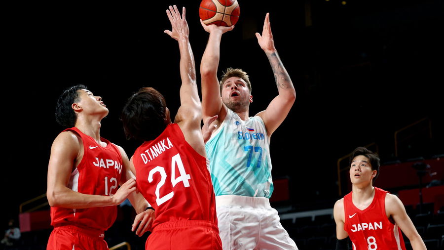 Tokyo 2020 Olympics – Basketball – Men – Group C – Slovenia v Japan – Saitama Super Arena, Saitama, Japan – July 29, 2021. Luka Doncic of Slovenia in action with Daiki Tanaka of Japan and Y. Watanabe of Japan REUTERS/Alkis Konstantinidis