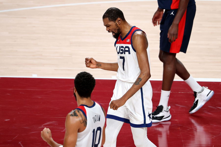 Tokyo 2020 Olympics – Basketball – Men – Gold medal match – France v United States – Saitama Super Arena, Saitama, Japan – August 7, 2021. Kevin Durant of the United States celebrates after scoring a basket REUTERS/Molly Darlington
