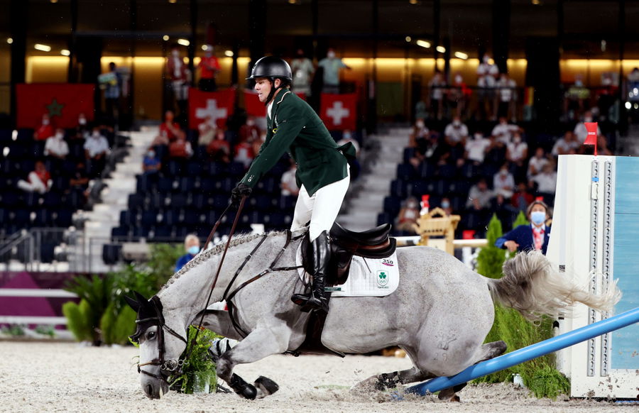 Tokyo 2020 Olympics – Equestrian – Jumping – Team – Qualification – Equestrian Park – Tokyo, Japan – August 6, 2021. Shane Sweetnam of Ireland tries to control his horse, Alejandro. REUTERS/Alkis Konstantinidis