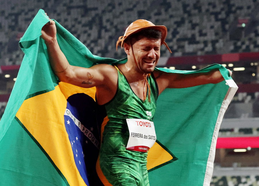 Tokyo 2020 Paralympic Games – Athletics – Men’s 100m – T47 Final – Olympic Stadium, Tokyo, Japan – August 27, 2021. Petrucio Ferreira Dos Santos of Brazil celebrates after winning gold with a flag of Brazil REUTERS/Ivan Alvarado TPX IMAGES OF THE DAY
