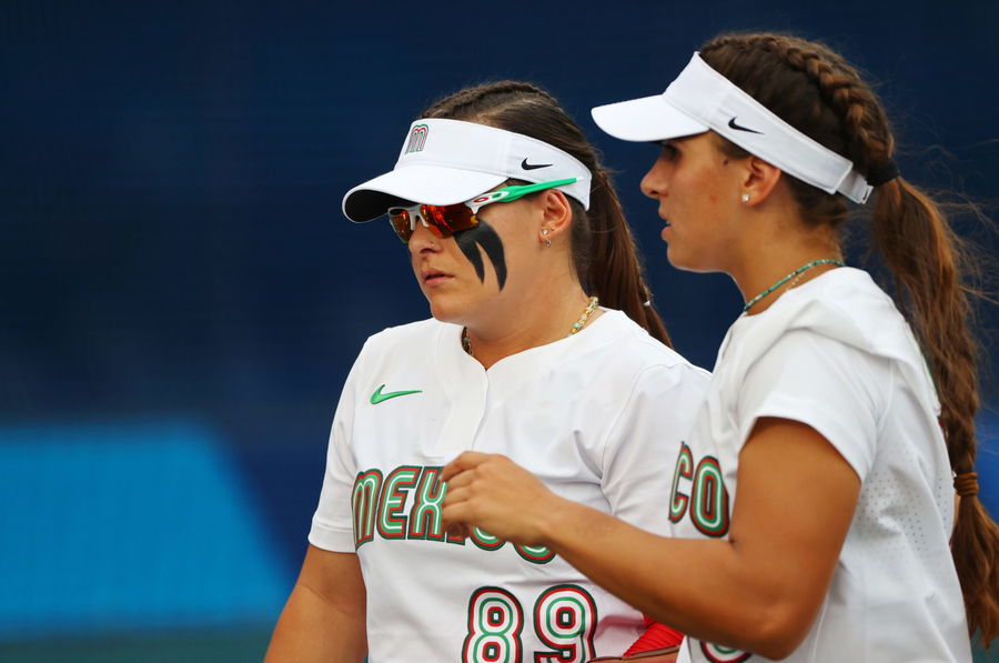 Tokyo 2020 Olympics – Softball – Women – Opening Round – Mexico v Canada – Fukushima Azuma Baseball Stadium – Fukushima, Japan – July 21, 2021. Sierra Denae Hyland Banuelos of Mexico and team mate. REUTERS/Jorge Silva