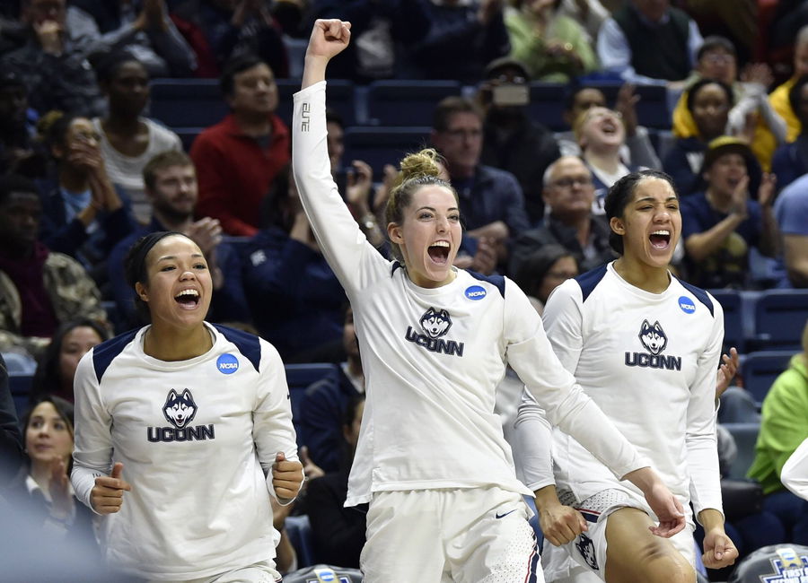 March 17, 2018 – Storrs, CT, USA – From left, Connecticut s Napheesa Collier, Katie Lou Samuelson and Gabby Williams celebrate from the bench in the first round of the NCAA College League USA Tournament against St. Francis (PA) at Gampel Pavilion in Storrs, Conn., on Saturday, March 17, 2018. UConn advanced, 140-52. NCAA Tournament: St. Francis at Connecticut – ZUMAm67_ 20180317_zaf_m67_003 Copyright: xBradxHorriganx
