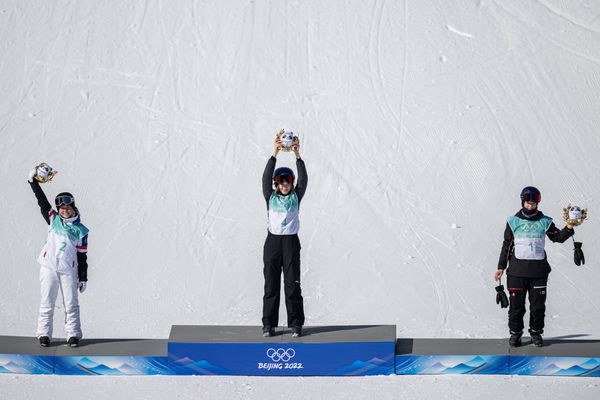 220208 Tess Ledeux of France, Eileen Gu of China and Mathilde Gremaud of Switzerland celebrate on the podium after competing in women s freestyle skiing big air final during day 4 of the 2022 Winter Olympics on February 8, 2022 in Beijing. Photo: Maxim Thor / BILDBYRAN / kod MT / MT0309 freestyle Olympic Games, Olympische Spiele, Olympia, OS olympics winter olympics os ol olympiska spel vinter-os olympiske leker peking peking 2022 beijing 2022 beijing 2022 olympic games beijing 2022 winter olympic games peking-os beijing-ol vinter-ol 4 bbeng dag 4 jubel *** 220208 Tess Ledeux of France, Eileen Gu of China and Mathilde Gremaud of Switzerland celebrate on the podium after competing in women s freestyle skiing big air final during day 4 of the 2022 Winter Olympics on February 8, 2022 in Beijing Photo Maxim Thor BILDBYRAN kod MT MT0309 freestyle olympic games olympics winter olympics os ol olympiska spel vinter os olympiske leker peking peking 2022 beijing 2022 beijing 2022 olympic games beijing 2022 winter olympic games peking os beijing ol vinter ol 4 bbeng dag 4 jubel, PUBLICATIONxNOTxINxSWExNORxAUT Copyright: MAXIMxTHORE BB220208MT029