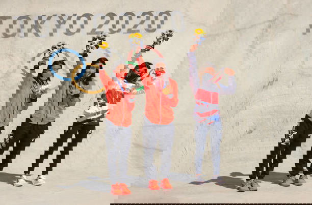 TOKYO, JAPAN – AUGUST 04: Bronze medalist Sky Brown of Team Great Britain (right), Gold medalist Sakura Yosozumi of Team Japan (center) and Silver medalist Kokona Hiraki of Team Japan (left) celebrate after the Women’s Skateboarding Park Finals on day twelve of the Tokyo 2020 Olympic Games at Ariake Urban Sports Park on August 04, 2021 in Tokyo, Japan. (Photo by Ezra Shaw/Getty Images)