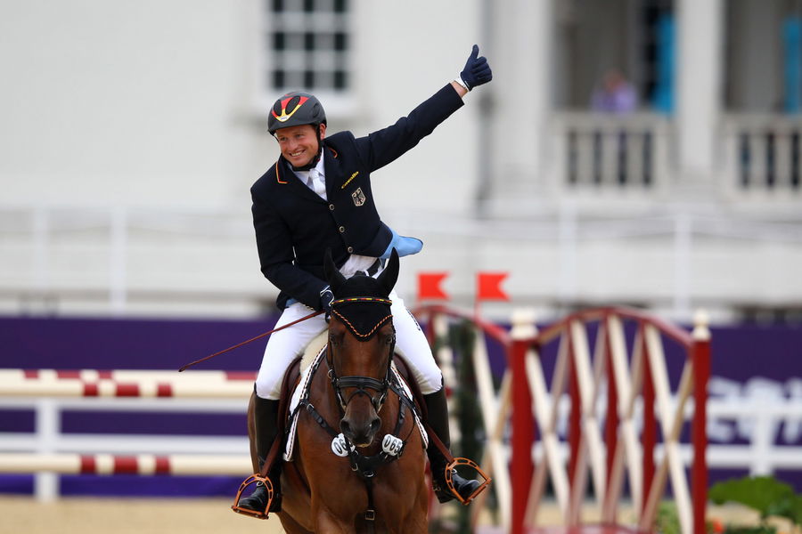 LONDON, ENGLAND – JULY 31: Michael Jung of Germany riding Sam celebrates winning the Gold medal in the Individual Jumping Equestrian Final on Day 4 of the London 2012 Olympic Games at Greenwich Park on July 31, 2012 in London, England. (Photo by Alex Livesey/Getty Images)
