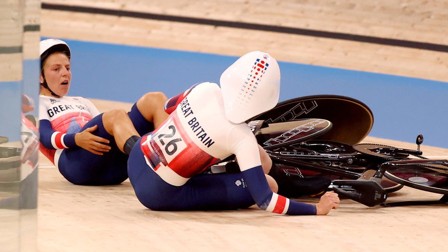 Tokyo 2020 Olympics – Cycling – Track – Women’s Team Pursuit – 1st Round – Izu Velodrome, Shizuoka, Japan – August 3, 2021. Katie Archibald of Britain and Neah Evans of Britain crash after the race. REUTERS/Matthew Childs