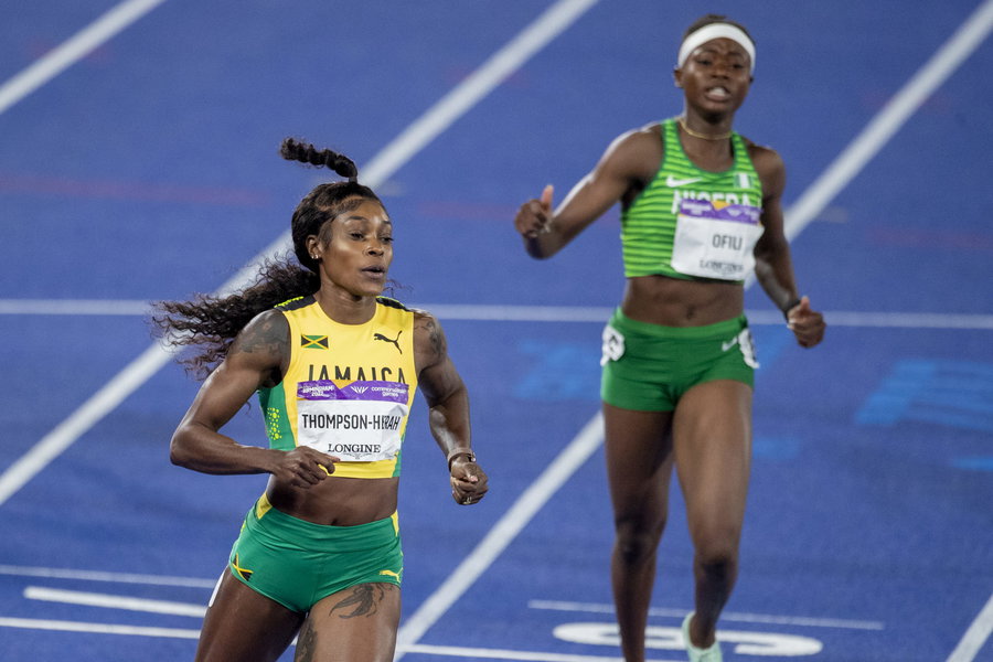 BIRMINGHAM, ENGLAND – AUGUST 6: Elaine Thompson-Herah of Jamaica wins the gold medal in the Women’s 200m Final with Favour Ofili of Nigeria winning the silver medal during the Athletics competition at Alexander Stadium during the Birmingham 2022 Commonwealth Games on August 6, 2022, in Birmingham, England. (Photo by Tim Clayton/Corbis via Getty Images)