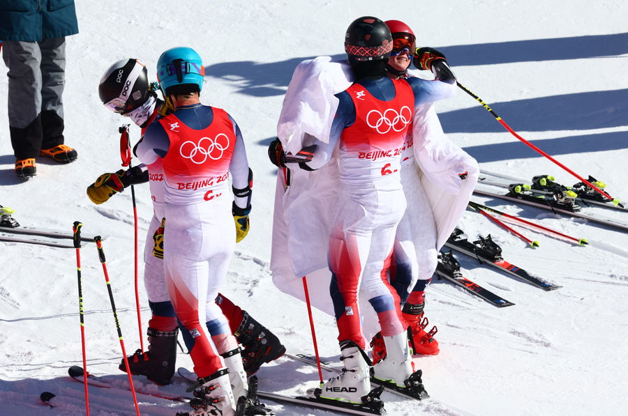 2022 Beijing Olympics – Alpine Skiing – Mixed Team Parallel Small Final – National Alpine Skiing Centre, Yanqing district, Beijing, China- February 20, 2022. Paula Moltzan of the United States, Mikaela Shiffrin of the United States, Tommy Ford of the United States and River Radamus of the United States hug after losing the Small Final. REUTERS/Denis Balibouse
