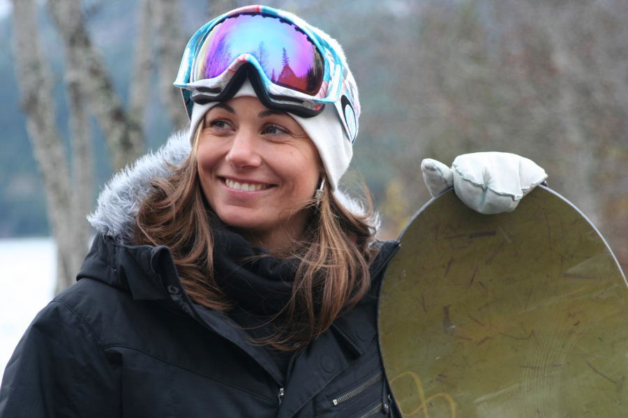 Maelle Ricker in her Globo Surf jacket and trusty snowboard