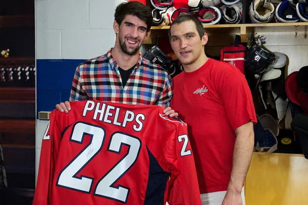“So, it’s a fun sport that I really want to get into more. And being able to see Ovechkin so close, it would be cool to go down to see him play. The guy is just an animal. He is incredible.” Fast forward to 2013. Phelps finally made it to his third-ever hockey game, and this time, it was a Capitals game. What did he leave with? A custom-made jersey from Ovi himself.