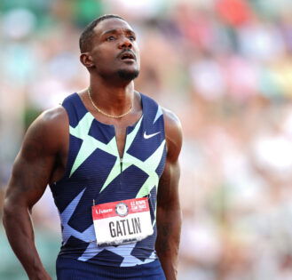 EUGENE, OREGON – JUNE 20: Justin Gatlin looks on after the Men’s 100 Meter Final on day 3 of the 2020 U.S. Olympic Track & Field Team Trials at Hayward Field on June 20, 2021 in Eugene, Oregon. (Photo by Patrick Smith/Getty Images)