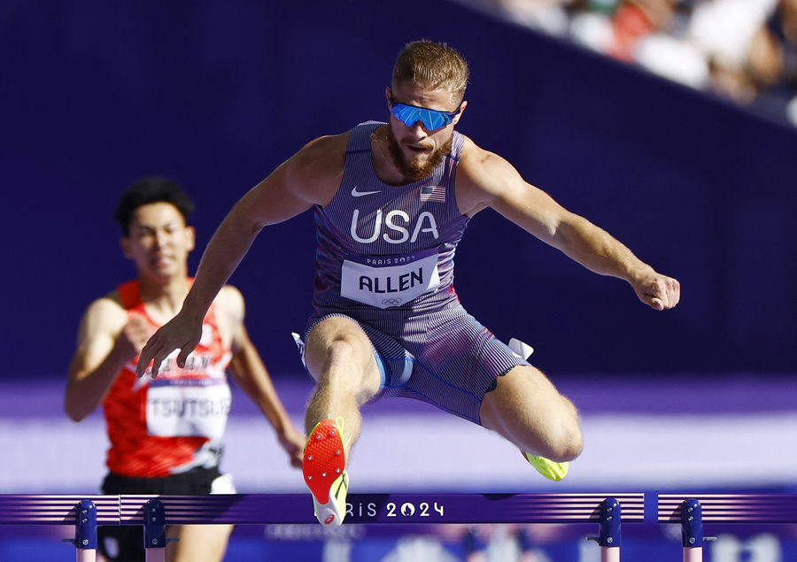 Paris 2024 Olympics – Athletics – Men’s 400m Hurdles Round 1 – Stade de France, Saint-Denis, France – August 05, 2024. Cj Allen of United States in action before finishing second in heat 3 REUTERS/Sarah Meyssonnier