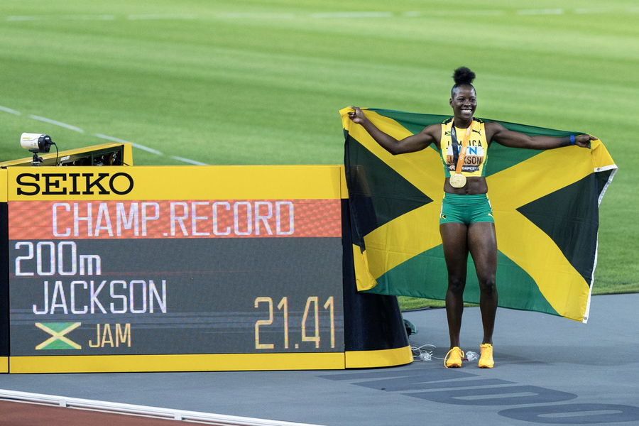 BUDAPEST, HUNGARY: August 25: Shericka Jackson of Jamaica celebrates her gold medal and championship record in the Women’s 200m Final during the World Athletics Championships, at the National Athletics Centre on August 25th, 2023 in Budapest, Hungary. (Photo by Tim Clayton/Corbis via Getty Images)