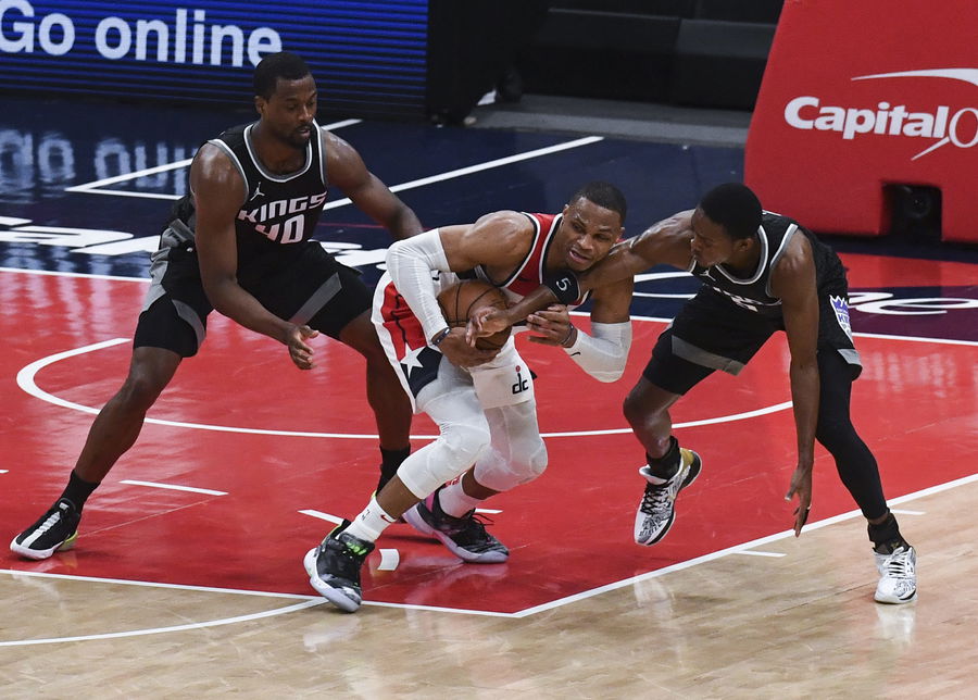 WASHINGTON, DC – MARCH 17: Washington Wizards guard Russell Westbrook (4) is fouled by Sacramento Kings guard De’Aaron Fox (5), right, during the fourth quarter of the game between the Washington Wizards and the Sacramento Kings on Wednesday, March 16, 2021. The Sacramento Kings defeated the Washington Wizards 121-119. (Photo by Toni L. Sandys/The Washington Post via Getty Images)