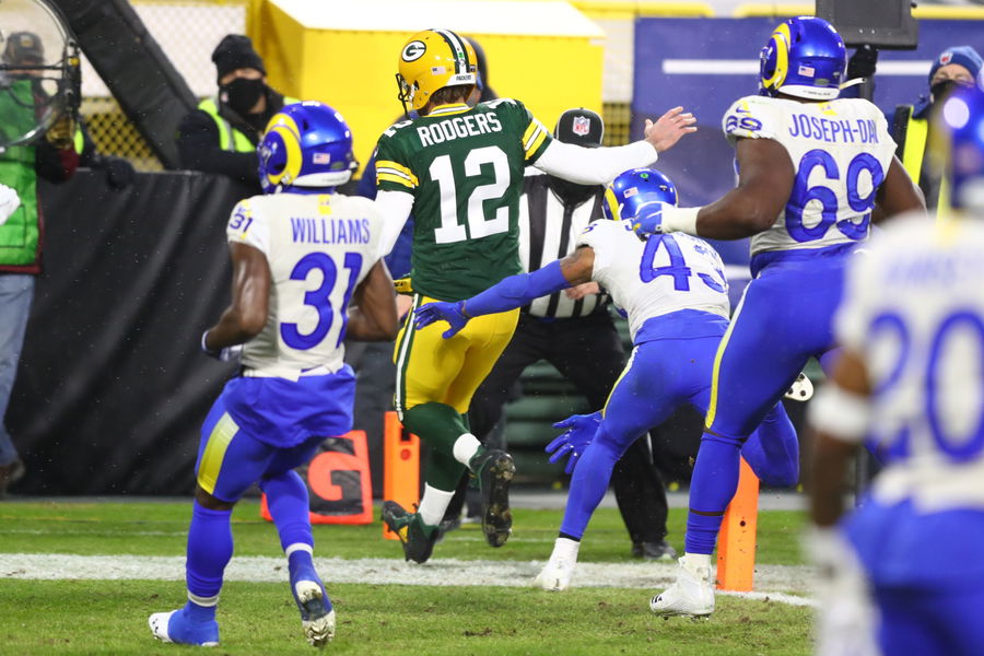 Jan 16, 2021; Green Bay, Wisconsin, USA; Green Bay Packers quarterback Aaron Rodgers (12) runs in for a touchdown during the first half of a NFC Divisional Round playoff game against the Los Angeles Rams at Lambeau Field. Mandatory Credit: Mark J. Rebilas-USA TODAY Sports