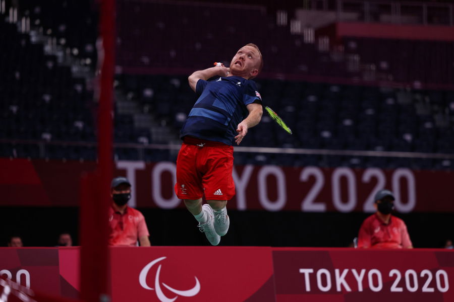 Tokyo 2020 Paralympic Games – Badminton – Men’s Singles SH6 Bronze Medal Match – Yoyogi National Stadium, Tokyo, Japan – September 5, 2021. Krysten Coombs of Britain in action against Vitor Goncalves Tavares of Brazil REUTERS/Athit Perawongmetha