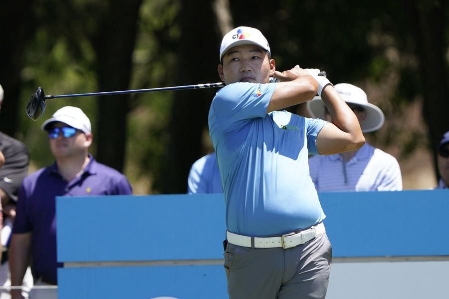 May 13, 2021; McKinney, Texas, USA; Sung Kang plays his shot from the fifth tee during the first round of the AT&T Byron Nelson golf tournament. Mandatory Credit: Jim Cowsert-USA TODAY Sports