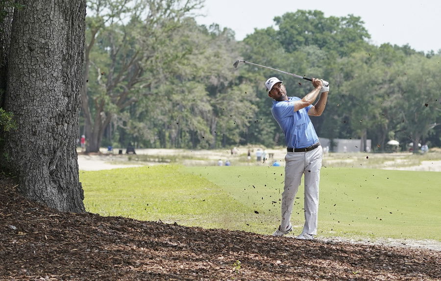 Jun 10, 2021; Ridgeland, South Carolina, USA; Kevin Kisner hits from the edge of the tree on the eighth fairway during the first round of the Palmetto Championship at Congaree golf tournament. Mandatory Credit: David Yeazell-USA TODAY Sports