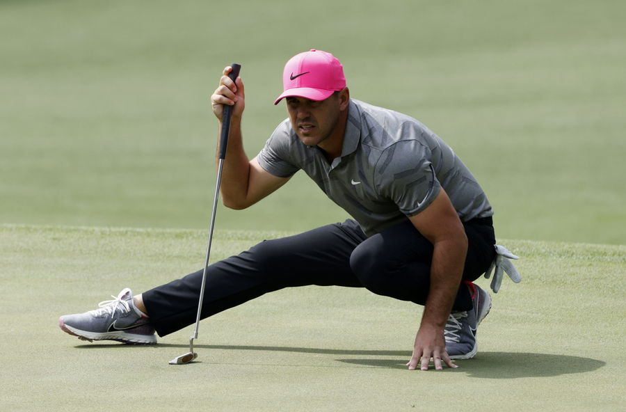 Golf – The Masters – Augusta National Golf Club – Augusta, Georgia, U.S. – April 8, 2021 Brooks Koepka of the U.S. lines up his putt on the 6th green during the first round REUTERS/Mike Segar