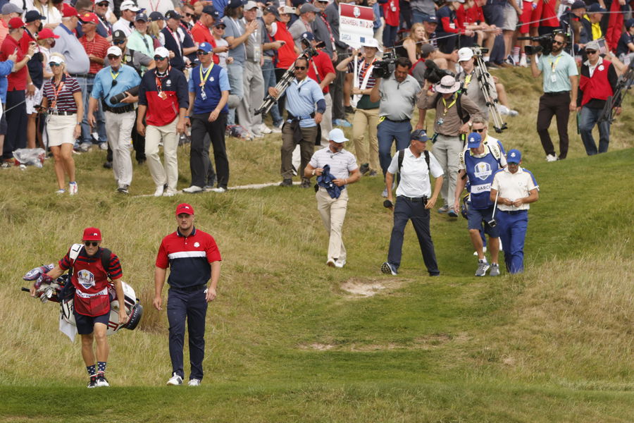 Golf – The 2020 Ryder Cup – Whistling Straits, Sheboygan, Wisconsin, U.S. – September 26, 2021 Team USA’s Bryson DeChambeau and Team Europe’s Sergio Garcia walk to the 3rd green during the Singles REUTERS/Jonathan Ernst