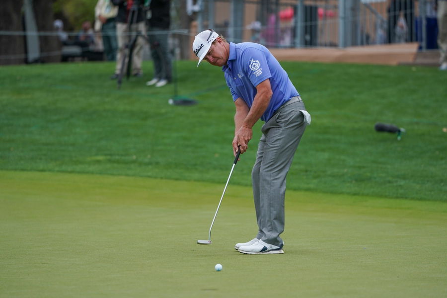 Apr 3, 2021; San Antonio, Texas, USA; Charley Hoffman watches his put on the 16th green during the third round of the Valero Texas Open golf tournament. Mandatory Credit: Daniel Dunn-USA TODAY Sports