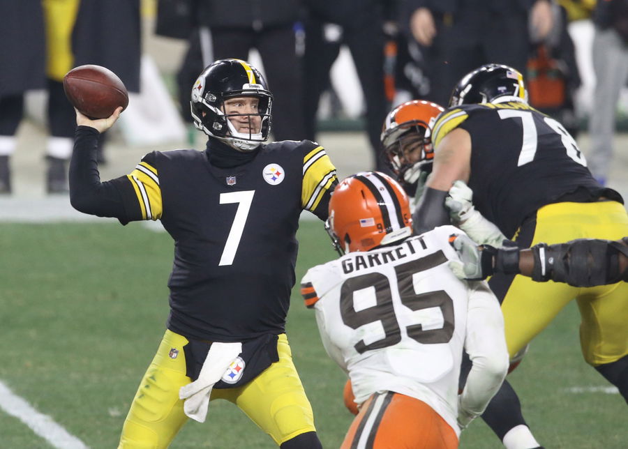 Jan 10, 2021; Pittsburgh, PA, USA; Pittsburgh Steelers quarterback Ben Roethlisberger (7) throws a pass against the Cleveland Browns in the third quarter of an AFC Wild Card playoff game at Heinz Field. Mandatory Credit: Charles LeClaire-USA TODAY Sports