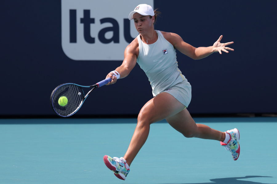 Mar 30, 2021; Miami, Florida, USA; Ashleigh Barty of Australia hits a forehand against Aryna Sabalenka of Belarus (not pictured) in a women’s singles quarterfinal in the Miami Open at Hard Rock Stadium. Mandatory Credit: Geoff Burke-USA TODAY Sports