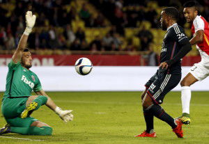 Lyon’s Alexandre Lacazette (R) fails to score against Monaco’s goalkeeper Danijel Subasic during their French Ligue 1 soccer match at Louis II stadium in Monaco, October 16, 2015. REUTERS/Eric Gaillard