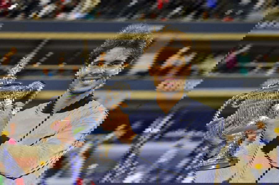Rafael Nadal smiles with the championship trophy following his 6-2, 3-6, 6-4, 6-1 victory against Novak Djokovic in their men’s final match on Day 15 of the 2013 US Open.