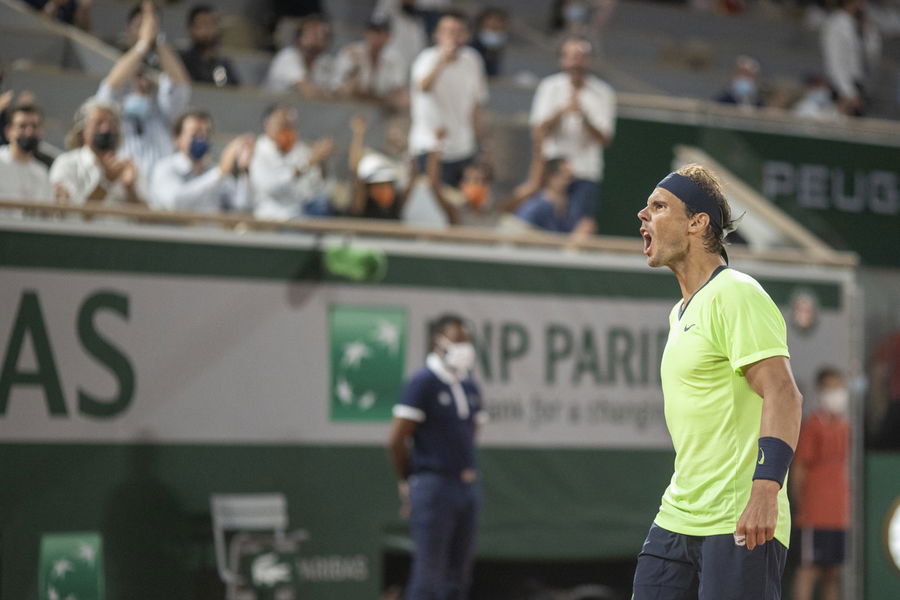PARIS, FRANCE June 11. Rafael Nadal of Spain reacts during his match against Novak Djokovic of Serbia on Court Philippe-Chatrier during the semi finals of the singles competition at the 2021 French Open Tennis Tournament at Roland Garros on June 11th 2021 in Paris, France. (Photo by Tim Clayton/Corbis via Getty Images)