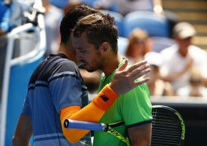 Canada’s Milos Raonic (L) consoles Serbia’s Viktor Troicki after Raonic won their third round match at the Australian Open tennis tournament at Melbourne Park, Australia, January 23, 2016. REUTERS/Thomas Peter