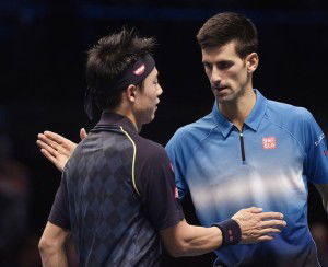 Men’s Singles – Serbia’s Novak Djokovic with Japan’s Kei Nishikori after winning their match