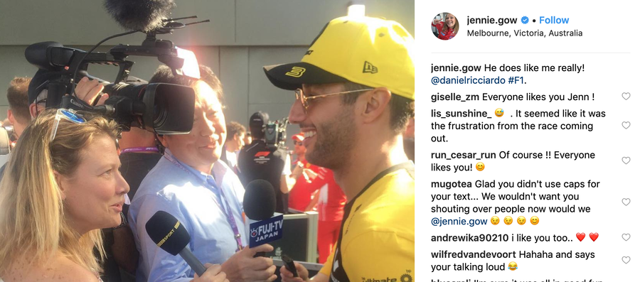 Later on Instagram, Gow posted an image on Instagram saying that contrary to Ricciardo’s declaration, he still liked her. Gow is an F1 Presenter and reporter who works for media giants, BBC.