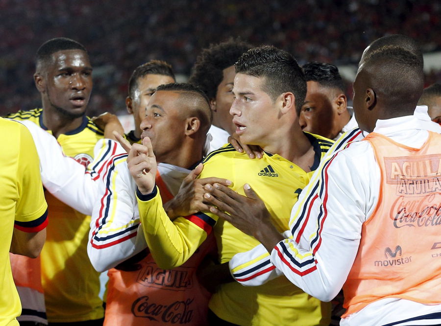 James Rodriguez (C) of Colombia celebrates his goal during the 2018 World Cup qualifying soccer match against Chile in Santiago, Chile, November 12, 2015. REUTERS/Rodrigo Garrido
