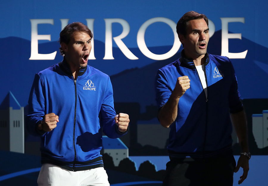 GENEVA, SWITZERLAND – SEPTEMBER 20: Rafael Nadal of Team Europe and teammate Roger Federer celebrate during the singles match between Stefanos Tsitsipas of Team Europe and Taylor Fritz of Team World during Day One of the Laver Cup 2019 at Palexpo on September 20, 2019, in Geneva, Switzerland. The Laver Cup will see six players from the rest of the World competing against their counterparts from Europe. Team World is captained by John McEnroe, and Team Europe is captained by Bjorn Borg. The tournament runs from September 20-22. (Photo by Julian Finney/Getty Images for Laver Cup)