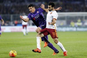 AS Roma’s Mohamed Salah (R) and Fiorentina’s Borja Valero fight for the ball during their Serie A soccer match at the Artemio Franchi stadium in Florence, October 25, 2015. REUTERS/Giampiero Sposito