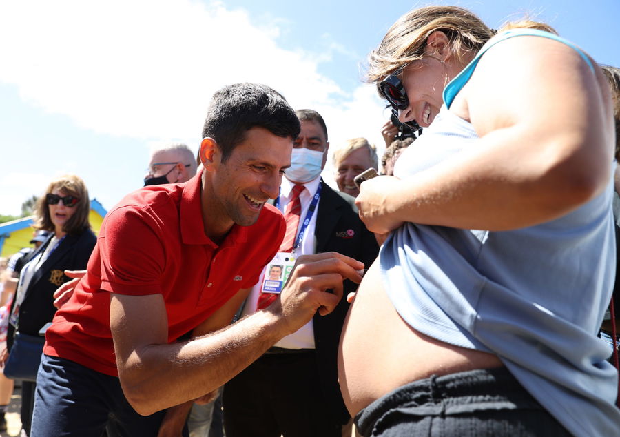 Australian Open champion Serbia’s Novak Djokovic signs his autograph on a pregnant woman’s belly. REUTERS/Loren Elliott