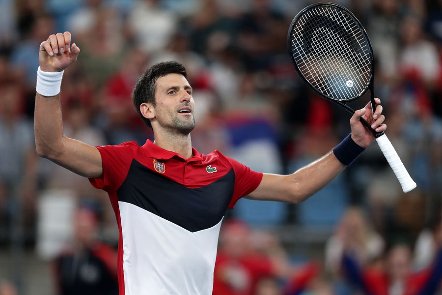 SYDNEY, AUSTRALIA – JANUARY 11: Novak Djokovic of Serbia celebrates winning match point during his semi-final singles match against Daniil Medvedev of Russia during day nine of the 2020 ATP Cup at Ken Rosewall Arena on January 11, 2020 in Sydney, Australia. (Photo by Mark Metcalfe/Getty Images)