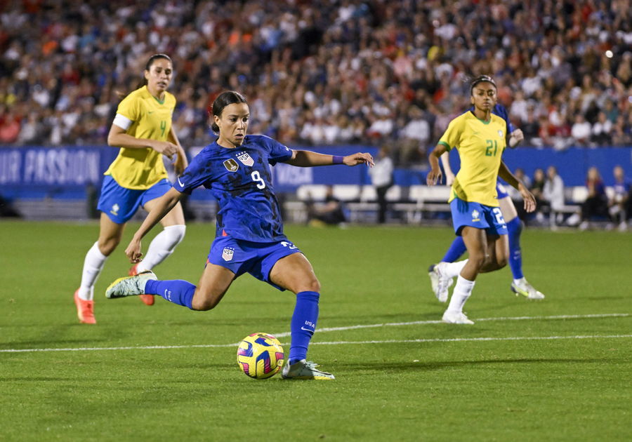 Feb 22, 2023: Team USA forward Mallory Swanson 9 takes a shot in the second half for a goal during the SheBelieves Cup soccer game between the U.S. Womenà s national team, Nationalteam and Brazil Womenà s National Team at Toyota Stadium in Frisco, Texas, USA defeated Brazil 2-1 /CSM Frisco USA – ZUMAcp2_ 20230222_zaf_cp2_033 Copyright: xAlbertxPenax