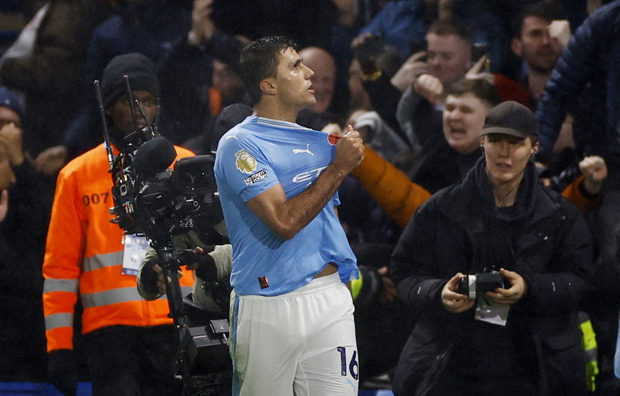 Soccer Football – Premier League – Chelsea v Manchester City – Stamford Bridge, London, Britain – November 12, 2023 Manchester City’s Rodri celebrates scoring their fourth goal Action Images via Reuters/John Sibley NO USE WITH UNAUTHORIZED AUDIO, VIDEO, DATA, FIXTURE LISTS, CLUB/LEAGUE LOGOS OR ‘LIVE’ SERVICES. ONLINE IN-MATCH USE LIMITED TO 45 IMAGES, NO VIDEO EMULATION. NO USE IN BETTING, GAMES OR SINGLE CLUB/LEAGUE/PLAYER PUBLICATIONS.