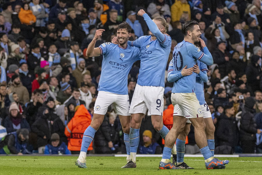 Manchester, England, 14th March 2023: Erling Haaland and Ruben Dias of Manchester CIty celebrate Erling Haaland s hatrick during the UEFA Champions League round of 16 leg two match between Manchester City and RB Leipzig at Etihad Stadium on March 14, 2023 in Manchester, United Kingdom. Photo by Richard Callis/SPP Richard Callis/SPP PUBLICATIONxNOTxINxBRAxMEX Copyright: xRichardxCallis/SPPx spp-en-RiCa-RC3_M.City_Leipzig_14Mar2023_RC-98030