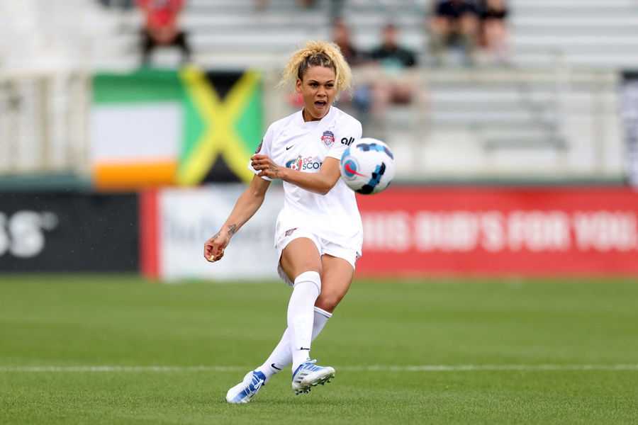 CARY, NC – MAY 7: Trinity Rodman #2 of the Washington Spirit crosses the ball during a game between Washington Spirit and North Carolina Courage at Sahlen’s Stadium at WakeMed Soccer Park on May 7, 2022 in Cary, North Carolina. The Courage defeated the Spirit 2-1 in the 2022 NWSL Challenge Cup Final. (Photo by Andy Mead/ISI Photos/Getty Images)