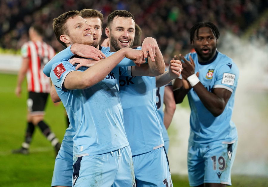 Sheffield United v Wrexham – FA Cup – Fourth Round Replay – Bramall Lane Wrexhams Paul Mullin left celebrates scoring his sides first goal from the penalty spot during the FA Cup fourth round replay at Bramall Lane, Sheffield. Picture date: Tuesday February 7, 2023. EDITORIAL USE ONLY No use with unauthorised audio, video, data, fixture lists, club/league logos or live services. Online in-match use limited to 120 images, no video emulation. No use in betting, games or single club/league/player publications. PUBLICATIONxNOTxINxUKxIRL Copyright: xMikexEgertonx 70902579