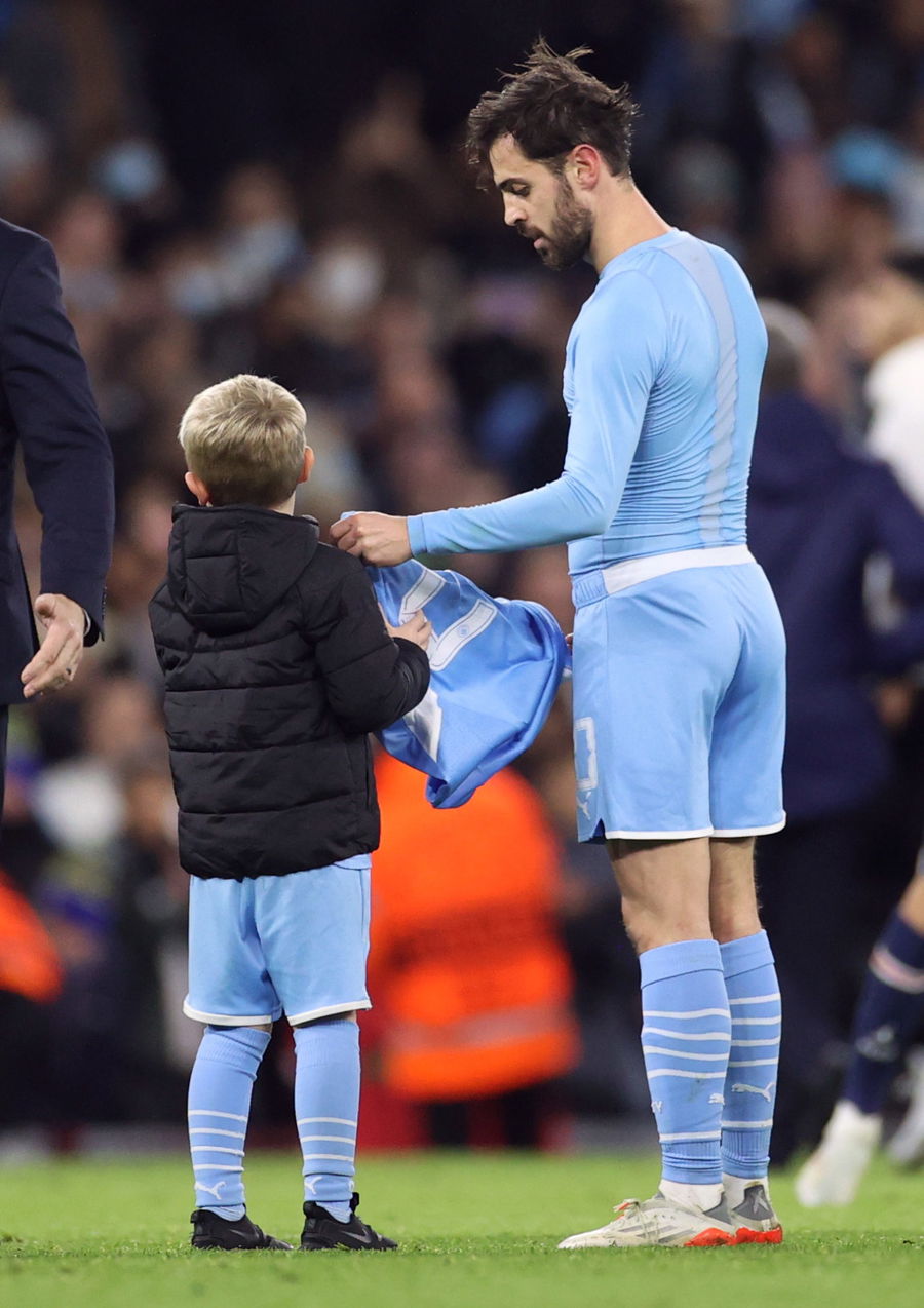 Soccer Football – Champions League – Group A – Manchester City v Paris St Germain – Etihad Stadium, Manchester, Britain – November 24, 2021 Manchester City’s Bernardo Silva with a young child after the match Action images via Reuters/Carl Recine