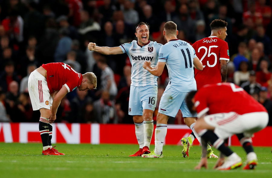 Soccer Football – Carabao Cup – Third Round – Manchester United v West Ham United – Old Trafford, Manchester, Britain – September 22, 2021 West Ham United’s Mark Noble celebrates with Nikola Vlasic as Manchester United’s Donny van de Beek looks dejected after the match Action Images via Reuters/Jason Cairnduff EDITORIAL USE ONLY. No use with unauthorized audio, video, data, fixture lists, club/league logos or ‘live’ services. Online in-match use limited to 75 images, no video emulation. No use in betting, games or single club /league/player publications. Please contact your account representative for further details. TPX IMAGES OF THE DAY