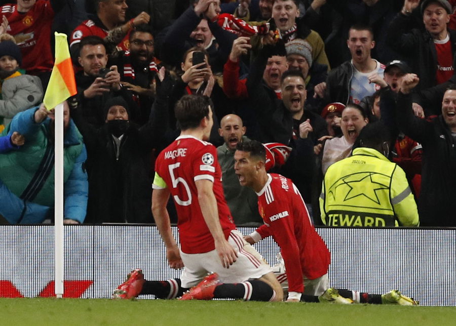 Soccer Football – Champions League – Group F – Manchester United v Atalanta – Old Trafford, Manchester, Britain – October 20, 2021, Manchester United’s Cristiano Ronaldo celebrates scoring their third goal with Harry Maguire REUTERS/Phil Noble
